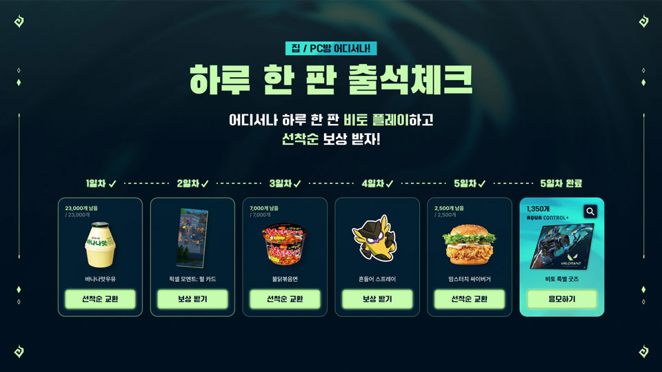비토의 출시를 기념해 오는 28일(일)까지 ‘비토 출석체크 이벤트’가 진행된다. 이번 이벤트는 집이나 PC방 어디서든 하루 한 번만 플레이하면 참여가 가능하며 일반전, 경쟁전, 신속 플레이 모드에서 모두 참여할 수 있다. 이벤트 참여자들은 누적 출석 일수에 따라 다양한 선착순 보상을 받을 수 있다. 특히 PC방에서 참여 시 최대 120개의 레디어나이트 포인트를 추가로 획득할 수 있으며 비토 출시를 기념한 한정판 굿즈와 게임 내 아이템 쿠폰, 게이밍 기어등 풍성한 보상이 준비되어 있다.